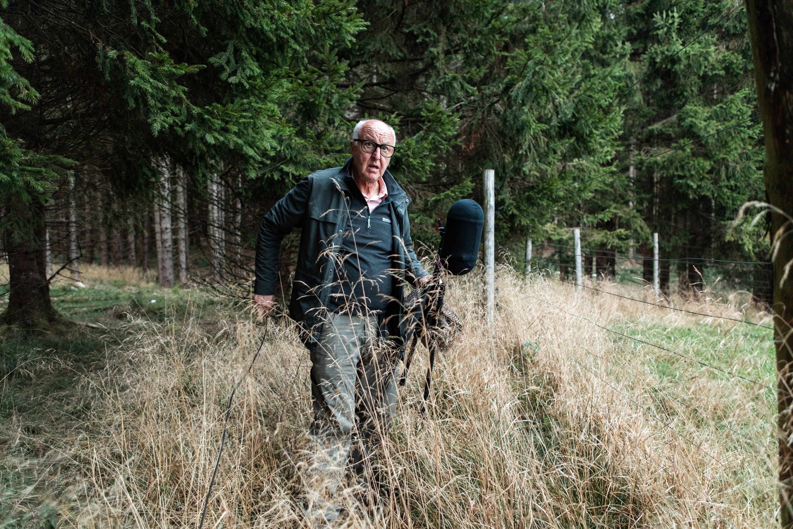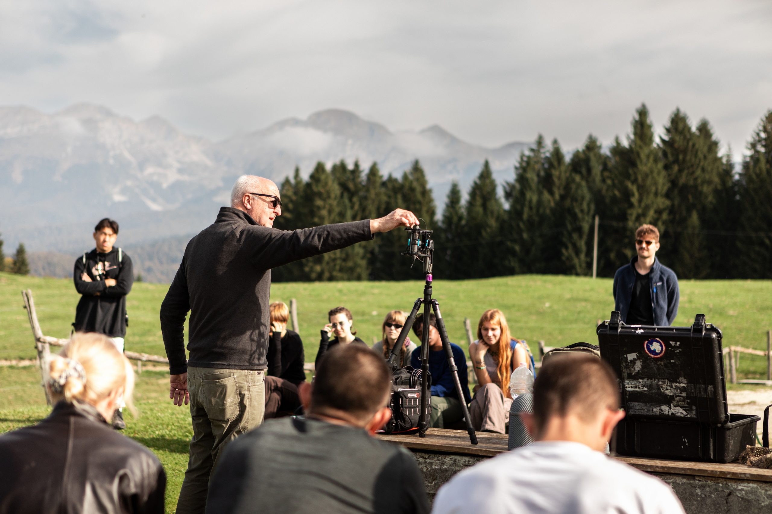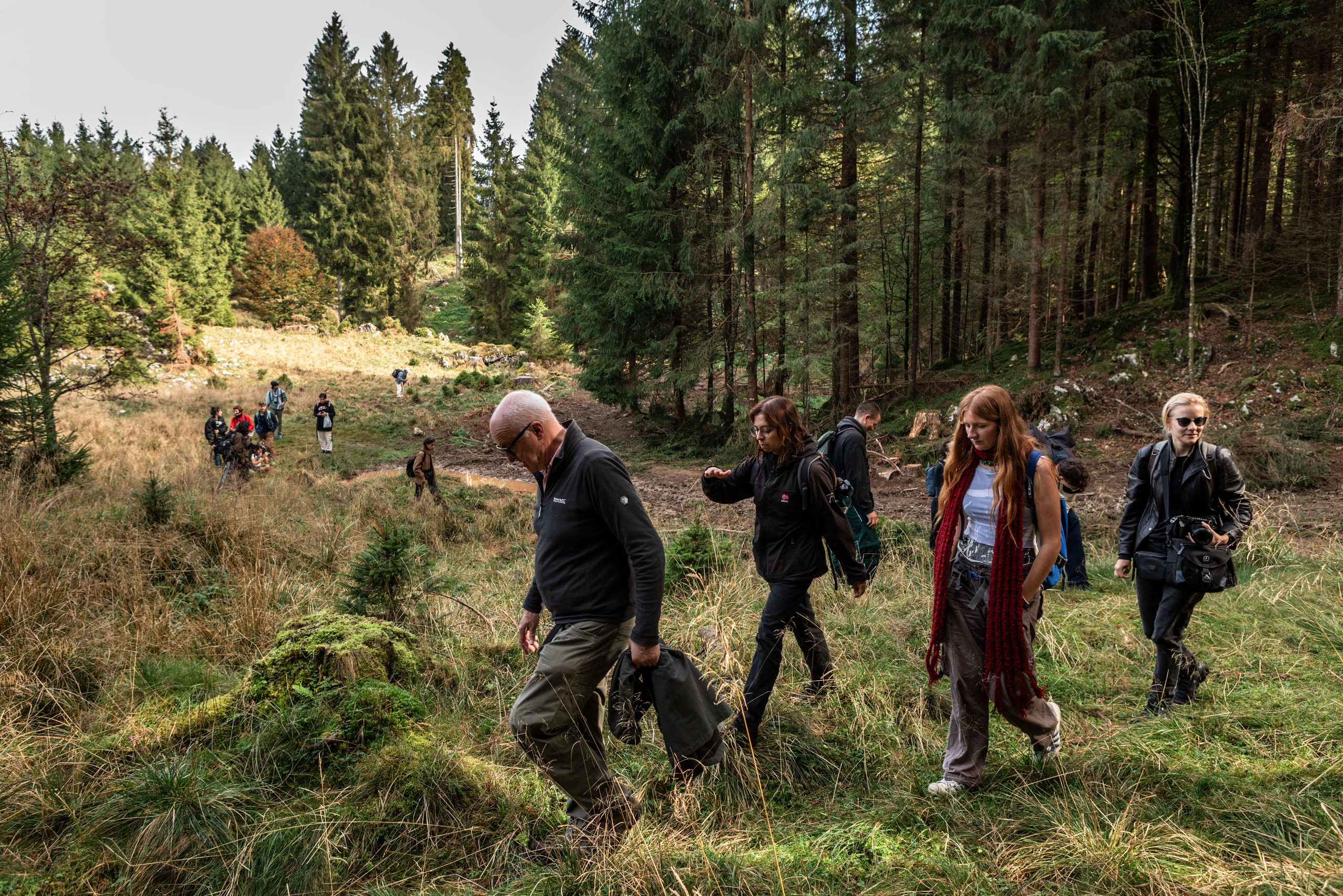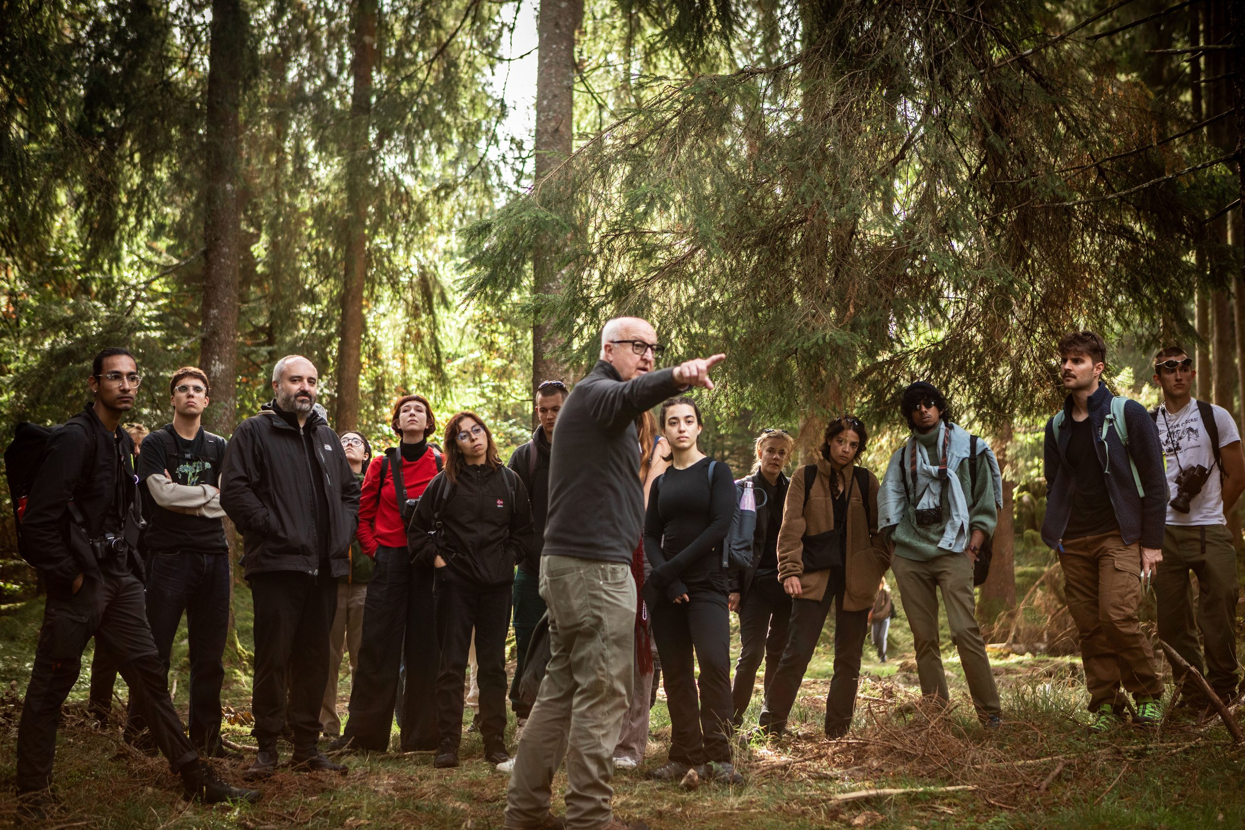 As Watson explains how to place camouflage for the equipment or when to use omnidirectional microphones instead of unidirectional ones, it becomes clear that the deer and their roaring are just a pretext: today fabricanti are here to learn about listening. Just a few steps inside the forest and the sounds change. The trampling, muffled by the underbrush, becomes lighter. The breaths deeper: pine resin can be inhaled. After a few minutes of walking, fabricanti come to a small glade. Looking northeast, the trees break off and the meadow ends in a steep wall. The acoustic is excellent. In this setting, even the dense webs of spiders seem part of the design of a large recording studio surrounded by greenery. Watson pauses.