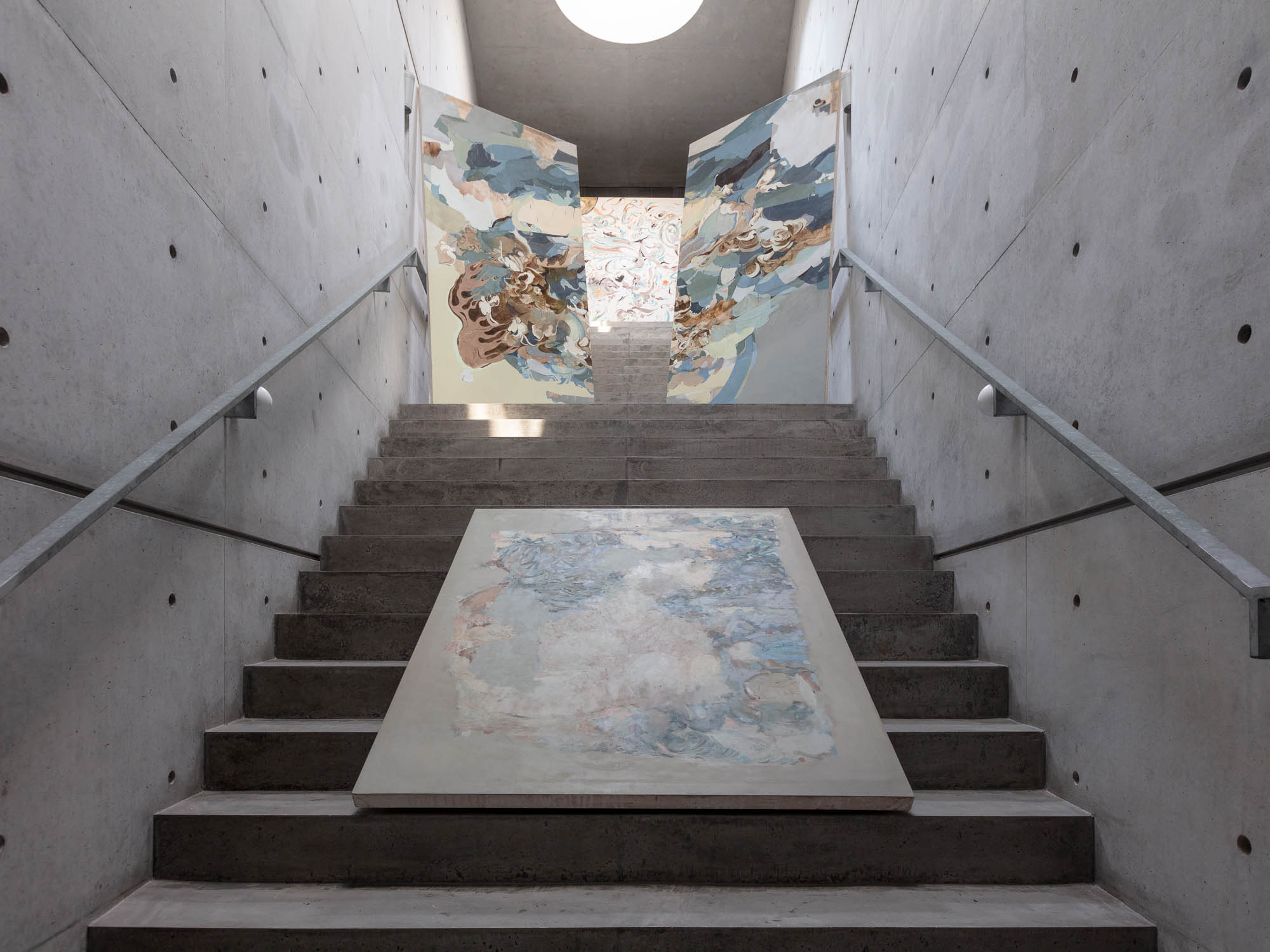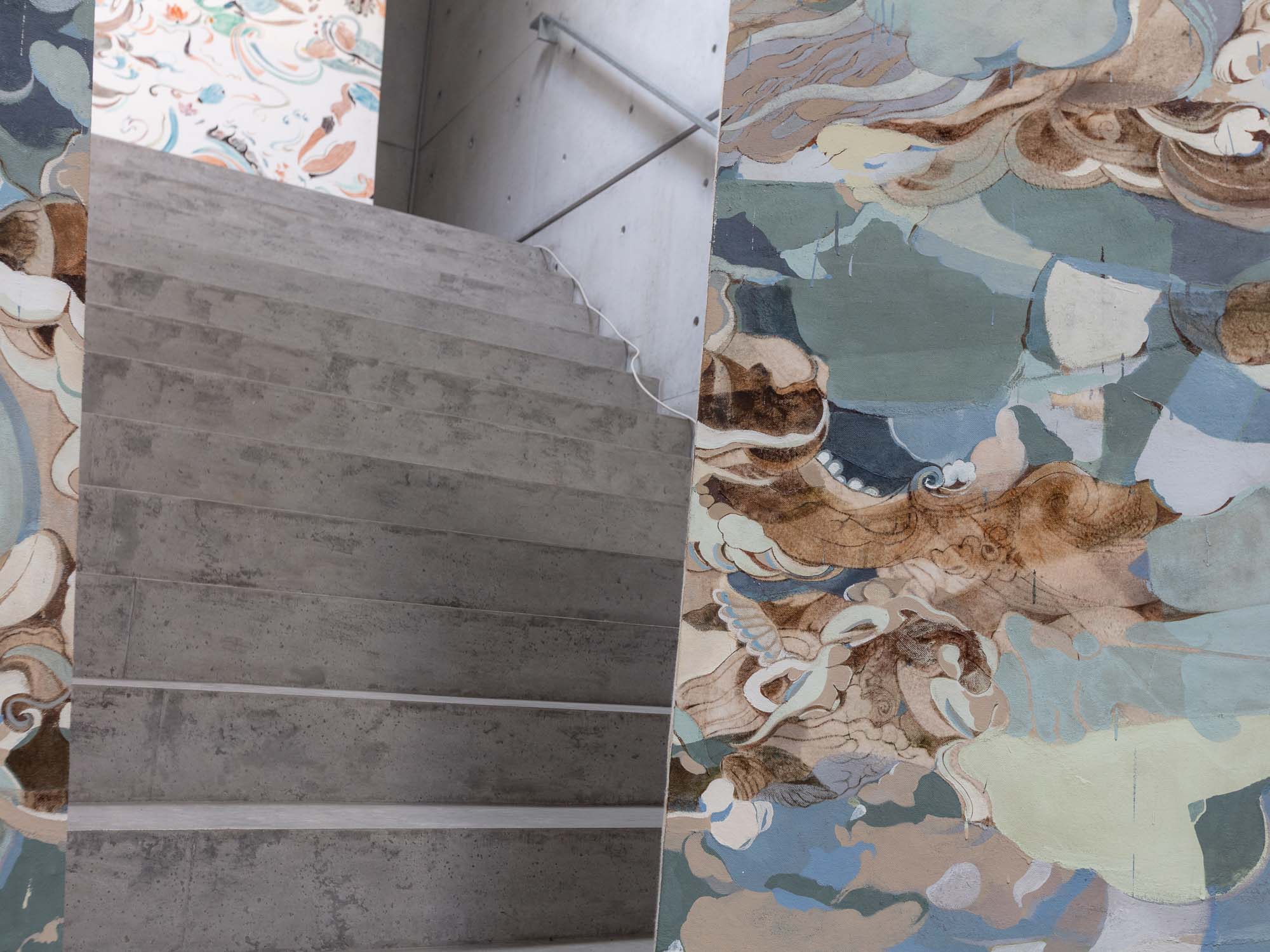 raining buried victory dance wildly falls into that spectrum of works that do not require understanding, as they do not contain a didactic narrative, such as to tell a hypothetical meaning of the work; only through careful reflections, suggestions, and examining the artist’s formal and aesthetic choices is it possible to reach an important significant dimension that opens views on man and the world. In front of Fang’s paintings, we could be in front of a Renaissance fresco, a vault of angels and saints peering down into the underworld, the suffering from which they are separated by a central glimmer of light. Yet the artist does not mention man for a very specific reason, which highlights how the latter is disappearing, how he is gradually being replaced by his own inventions. The perimeters of the human figure are only hinted at, its presence is alluded to, but every body is on its way to total disappearance, in the same way as it currently disappears in contemporary society, replaced by machines and artificial intelligences that take place in the formulation of thought and in the practical realization of the things that surround him. Man has vanished, he has become extinct, leaving only destruction behind him and by erasing everything he has even abolished the ideal of forgiveness and the aspiration towards this. The abstraction of man is in fact an unstoppable phenomenon that he himself started and Fang is a careful observer of man and his influences.